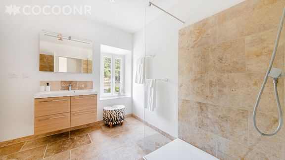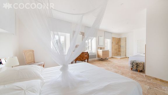 - Chambre 1 : un lit queen-size (160x200) avec une salle de bain avec douche, baignoire et WC