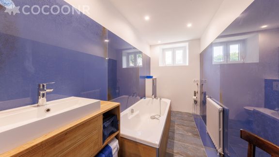 - Une salle de bain avec baignoire et WC