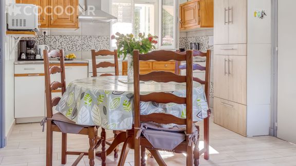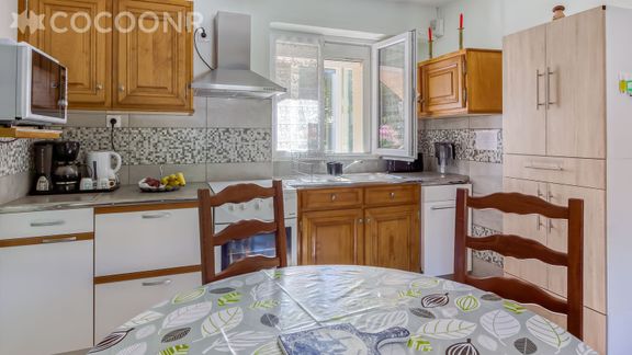 - Cuisine ouverte sur le séjour : réfrigérateur, four, plaques de cuisson, lave-vaisselle, micro-ondes, grille-pain, bouilloire, cafetière, vaisselle et couverts...