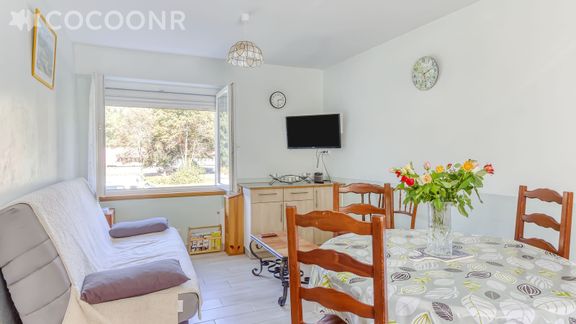 - Pièce de vie aménagée avec un canapé-lit double, TV, espace-repas pour 6 personnes.