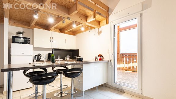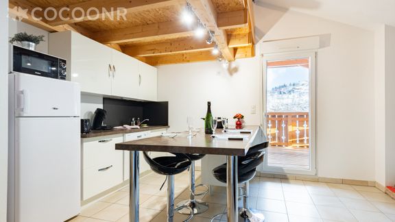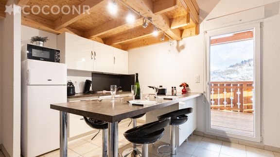 - Cuisine ouverte sur le séjour et entièrement équipée : lave-vaisselle, four, réfrigérateur, plaques de cuisson, micro-ondes, cafetière, bouilloire, grille-pain, vaisselle et couverts, espace repas pour 4 convives.