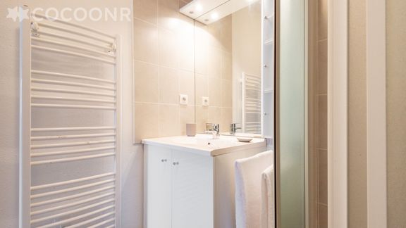 - Salle d'eau avec douche et sèche-serviettes.