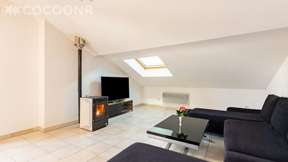 - Salon séjour aménagé avec canapé, TV, poêle à pellets (sac de 15 kg fourni).