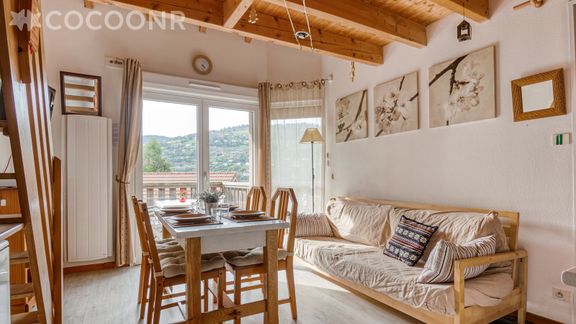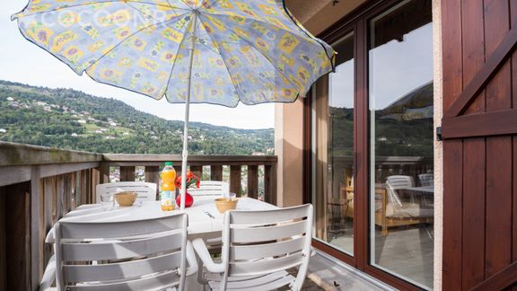 - Un balcon de 5 m² exposé ouest, d'où vous pourrez admirer la vue sur la colline et la vallée. Le balcon est aménagé avec un salon de jardin, et un parasol en été.