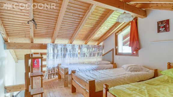 - A l'étage en mezzanine sous les combles : 2 lits simples, et un lit double (140 cm x 190 cm).