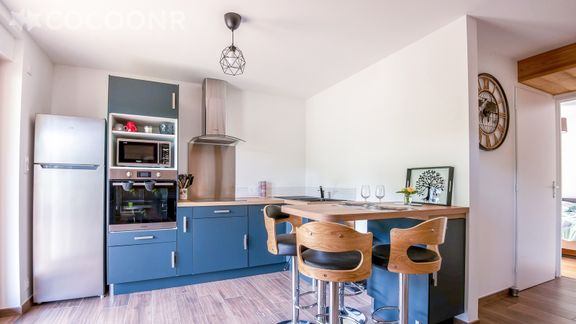 - Une cuisine ouverte équipée avec notamment : bouilloire électrique, four, four à micro-ondes, grille-pain, lave-vaisselle, plaques de cuisson, cafetière à dosettes Senseo...