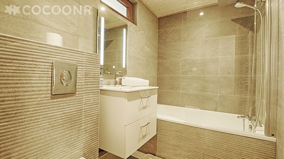 - Une salle de bain avec baignoire et WC