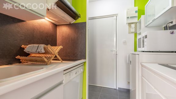 - Une cuisine équipée avec notamment : bouilloire électrique, four, four à micro-ondes, grille-pain, lave-vaisselle, plaques de cuisson, cafetière à dosettes Dolce Gusto...