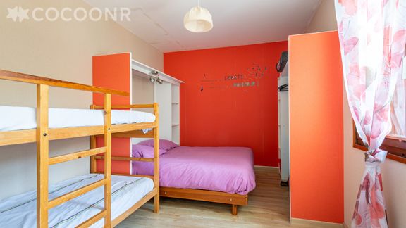 - Une chambre avec lits superposés, lit double (140×190) et des rangements.