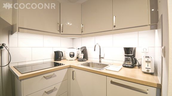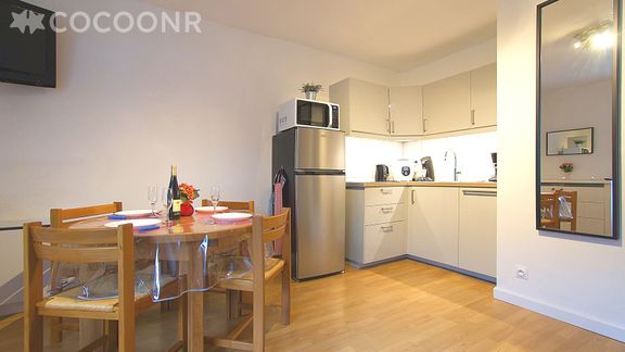 - Une cuisine équipée avec notamment : bouilloire électrique, four, four à micro-ondes, grille-pain, lave-vaisselle, plaques de cuisson...
