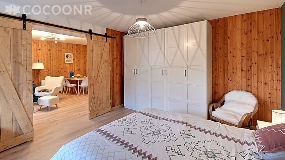 Le chambre à coucher est spacieuse et séparée du living par des panneaux de bois coulissants.