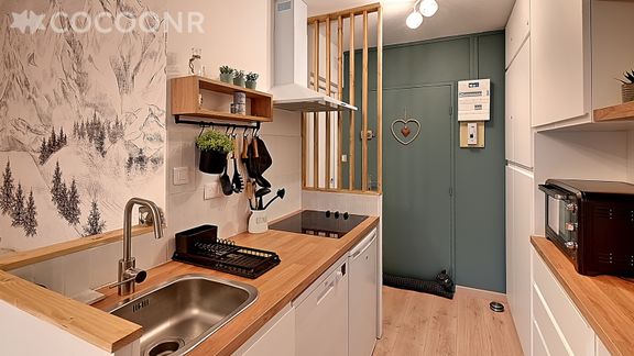 - Une cuisine équipée avec notamment : bouilloire électrique, four, four à micro-ondes, grille-pain, lave-vaisselle, plaques de cuisson...