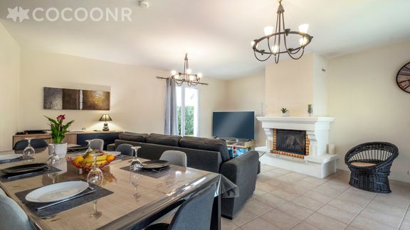 - Une pièce de vie de 35 m² avec canapé, TV, Wifi, cheminée (décorative) et coin repas.