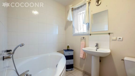- Chambre 3 : un lit double (140×190), un canapé-lit double et une salle de bain attenante avec baignoire d'angle, WC.