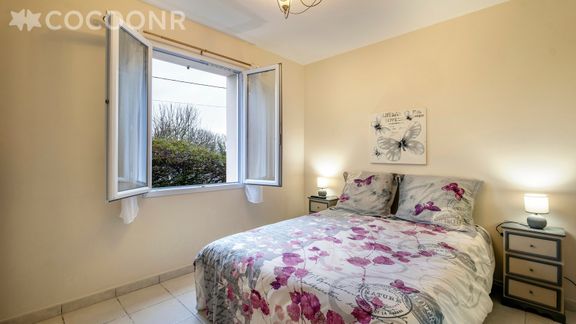 - Chambre 2 : un lit double (140×190), un lit bébé et une salle d'eau attenante avec douche, WC.