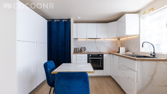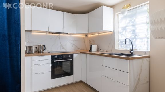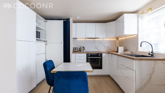 - Une cuisine ouverte équipée avec notamment : bouilloire électrique, four, four à micro-ondes, grille-pain, lave-vaisselle, plaques de cuisson...