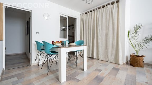 - Une belle pièce de vie lumineuse avec un coin salon doté d'un canapé-lit double d'un fauteuil, une table basse, une TV ainsi qu'un espace repas avec une table à manger pouvant accueillir jusqu'à 6 convives.