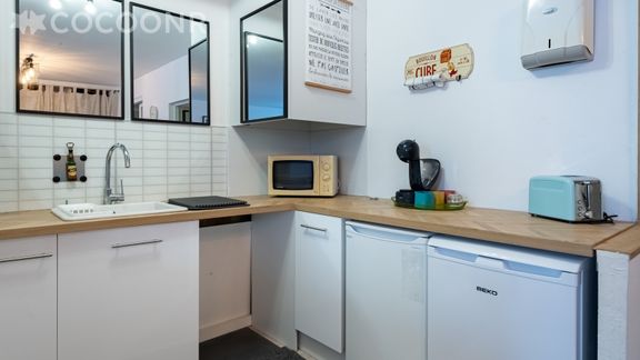 - Une cuisine ouverte sur l'espace salle à manger, entièrement équipée : un réfrigérateur, un four, des plaques de cuisson, un micro-ondes, un grille-pain, une cafetière à dosette Dolce Gusto, de la vaisselle et des couverts.