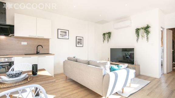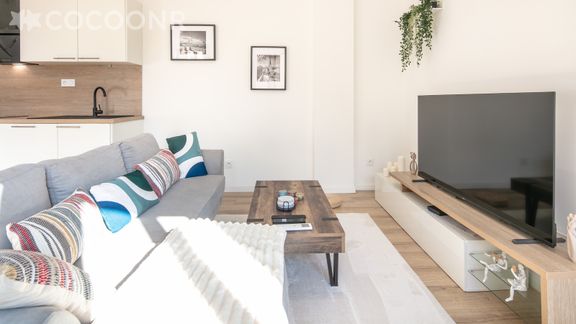 - Une pièce de vie de 20 m² avec TV connectée, canapé…