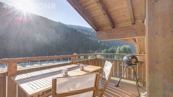- Un premier balcon, exposé sud et accessible depuis le salon aménagé avec une table et des chaises d’extérieur, ainsi qu'un barbecue pour profiter d'un bon repas au soleil face au panorama des montagnes !