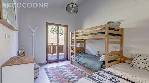 - Chambre 2 : parfaite pour des enfants avec un lit superposé (2 couchages), lit gigogne (1 couchage), un lit simple et un accès au balcon.