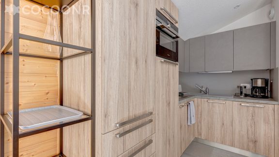- Une cuisine ouverte sur le salon, entièrement équipée : réfrigérateur, lave-vaisselle, congélateur, four, plaques à induction, micro-ondes, grille-pain, bouilloire, cafetière à filtre, appareil à raclette et à fondue... Lave-linge séchant.