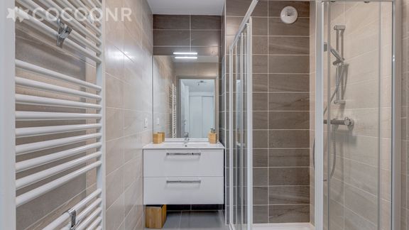 - Une salle d'eau avec douche, vasque, sèche-serviettes et sèche-cheveux.