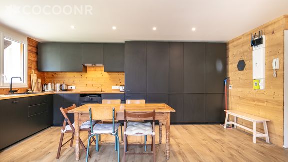 - Une cuisine ouverte équipée avec notamment : bouilloire électrique, four, grille-pain, lave-vaisselle, plaques de cuisson...