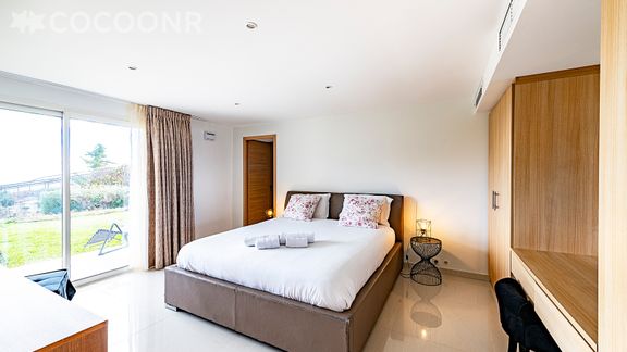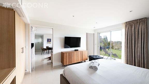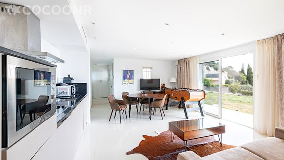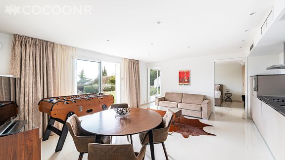 Situé au rez-de-chaussée d'une maison, cet appartement climatisé se compose d'une jolie pièce à vivre de 35 m² avec cuisine équipée, d'une belle chambre, de deux salles d'eau et vous pourrez profiter d'un jardin d'environ 100 m². Wifi (fibre optique), draps et serviettes inclus, nous n'attendons plus que vous !