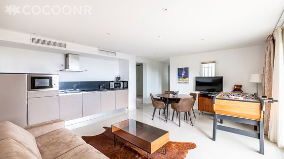 - Une pièce de vie de 35 m² avec TV, canapé-lit double, espace repas