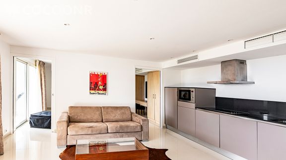 - Une cuisine ouverte, équipée avec notamment : bouilloire électrique, four, four à micro-ondes, lave-vaisselle, plaques de cuisson...