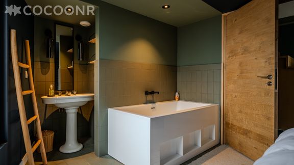 - Chambre 2 (suite parentale) : un lit king-size (180×200) avec dressing, baignoire et lavabo