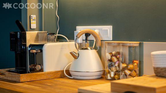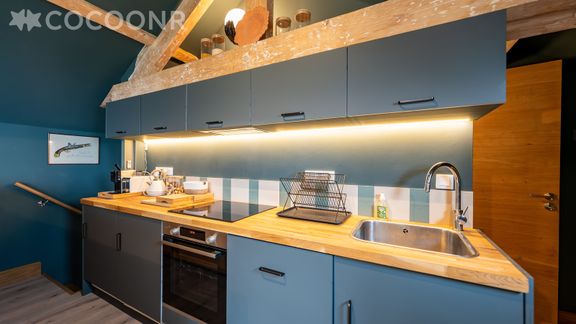 - Une cuisine équipée avec notamment : bouilloire électrique, four, grille-pain, lave-vaisselle, plaques de cuisson...