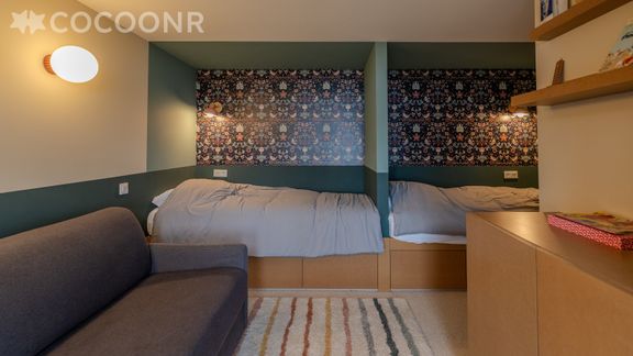 - Chambre 3 : deux lits simples, un canapé-lit et une douche à l'italienne avec lavabo