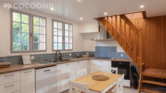 - Une cuisine équipée avec notamment : bouilloire électrique, four, four à micro-ondes, grille-pain, lave-vaisselle, plaques de cuisson...