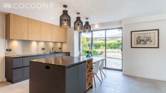 La cuisine, entièrement équipée, est un véritable paradis pour les amateurs de gastronomie. Vous y trouverez tout le nécessaire pour préparer vos plats préférés et déguster les spécialités locales, tandis qu'une cheminée élégante sépare harmonieusement l'espace séjour de la cuisine, ajoutant une touche chaleureuse et cosy à votre séjour.