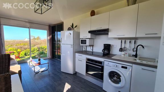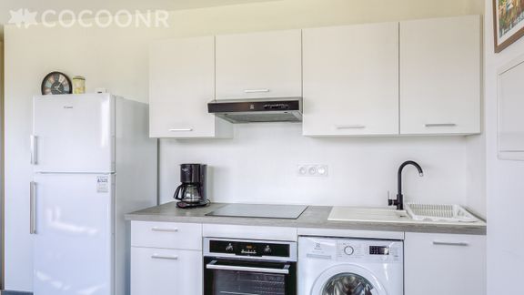 - Kitchenette ouverte et équipée : four, plaques de cuisson, réfrigérateur, bouilloire, grille-pain, cafetière, vaisselle et couverts, machine à laver
