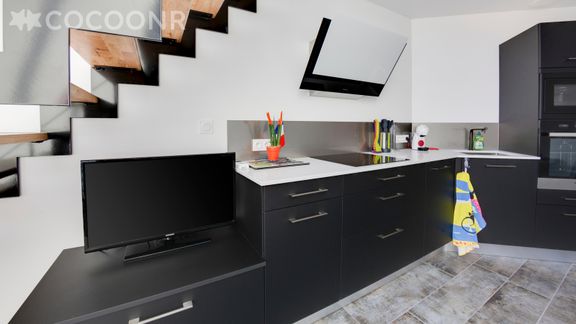 - Cuisine ouverte et équipée (four, micro-onde, lave vaisselle, cafetière expresso, …)