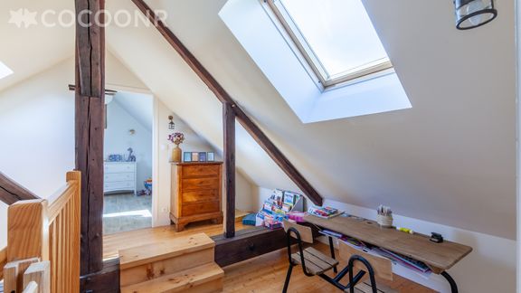 - Un palier avec bureau d'écolier et coin bibliothèque pour enfants.