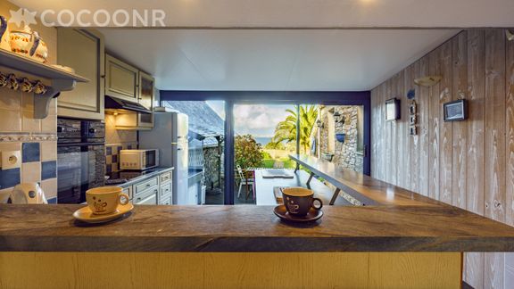 - Une cuisine vue mer équipée avec notamment : bouilloire électrique, four, four à micro-ondes, grille-pain, lave-vaisselle, plaques de cuisson...