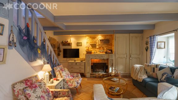 - Une pièce de vie de 40 m² avec TV, cheminée (première flambée fournie), canapé et un espace repas