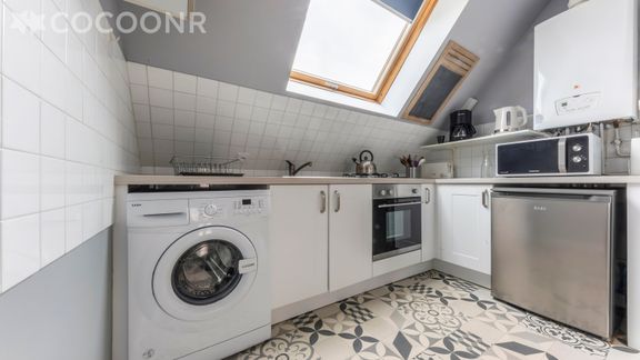 - Une cuisine ouverte équipée avec notamment : bouilloire électrique, four, four à micro-ondes, grille-pain, plaques de cuisson, machine à laver...