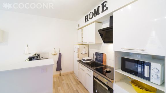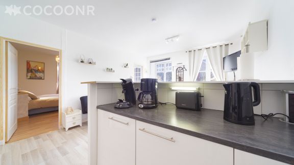 - Une cuisine ouverte équipée avec notamment : bouilloire électrique, four, four à micro-ondes, grille-pain, plaques à induction...