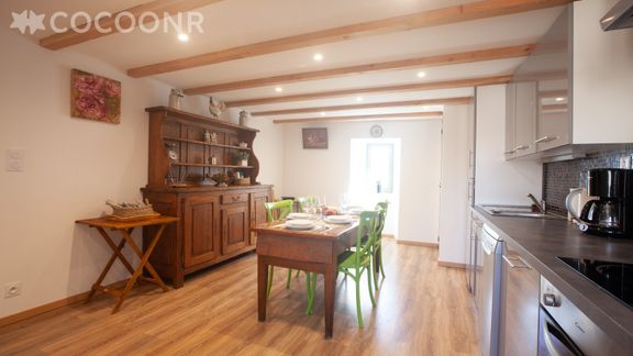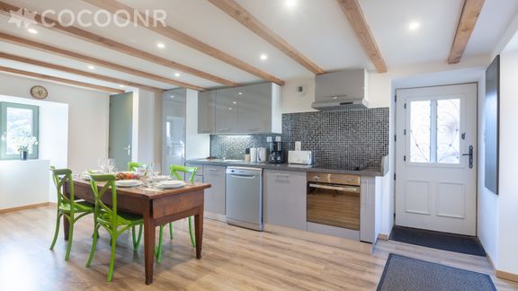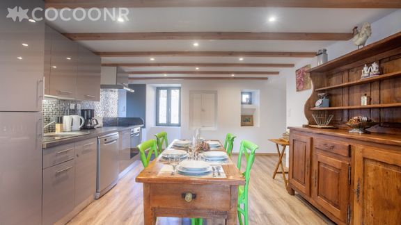 - Une cuisine équipée d'environ 25 m² avec notamment : bouilloire électrique, four, four à micro-ondes, grille-pain, lave-vaisselle, plaques de cuisson, machine à café à filtre... et espace repas.
