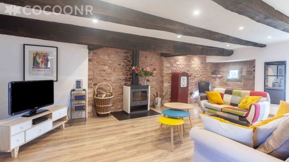 - Une pièce de vie de 28 m² avec TV, poêle(bois fourni) et canapés.