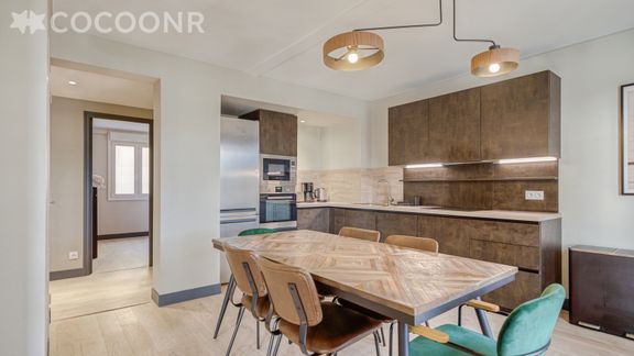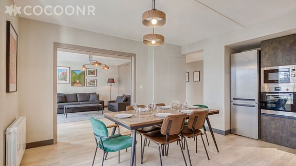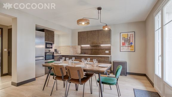 - Cuisine ouverte et équipée: lave-vaisselle, four, plaques de cuisson, réfrigérateur, micro-ondes, cafetière, vaisselle et couverts, table à manger, ...