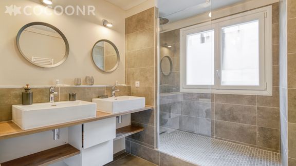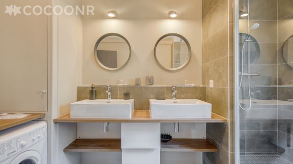 - Salle d'eau avec double vasque et grand douche à l'italienne, machine à laver et sèche serviettes