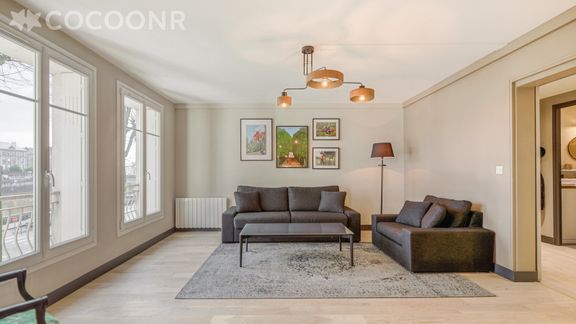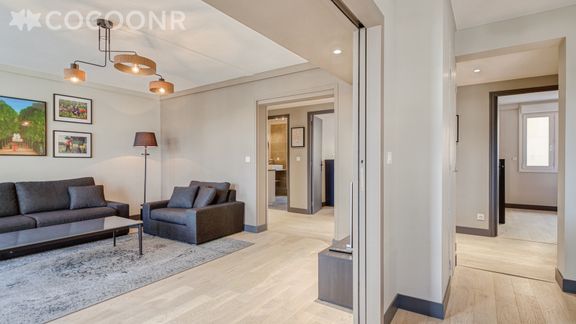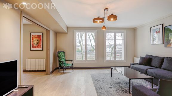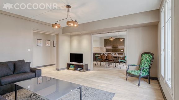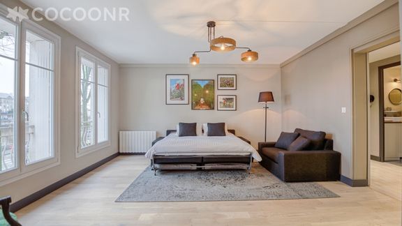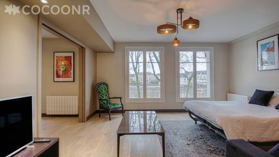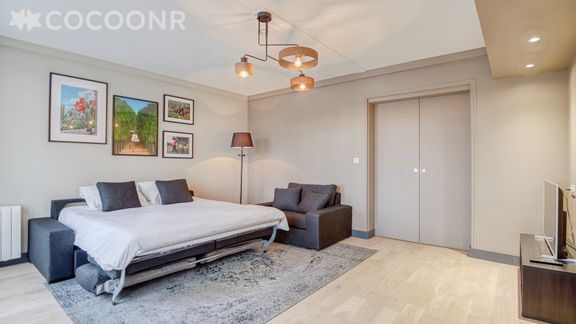 - Pièce de vie avec un canapé-lit et une TV connectées (possibilité de se connecter à Netflix, Deezer, Youtube, etc.). Le salon peut être isolé du reste de l'appartement pour dormir.