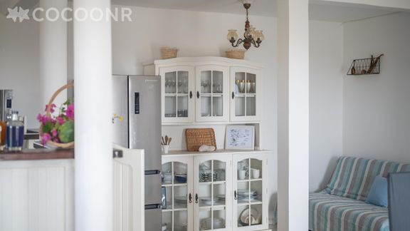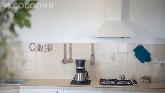 - Une cuisine ouverte équipée avec notamment : bouilloire électrique, four, four à micro-ondes, plaques de cuisson...