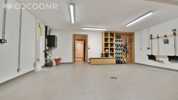 Garage privé avec espace ski-room et chauffe-bottes.